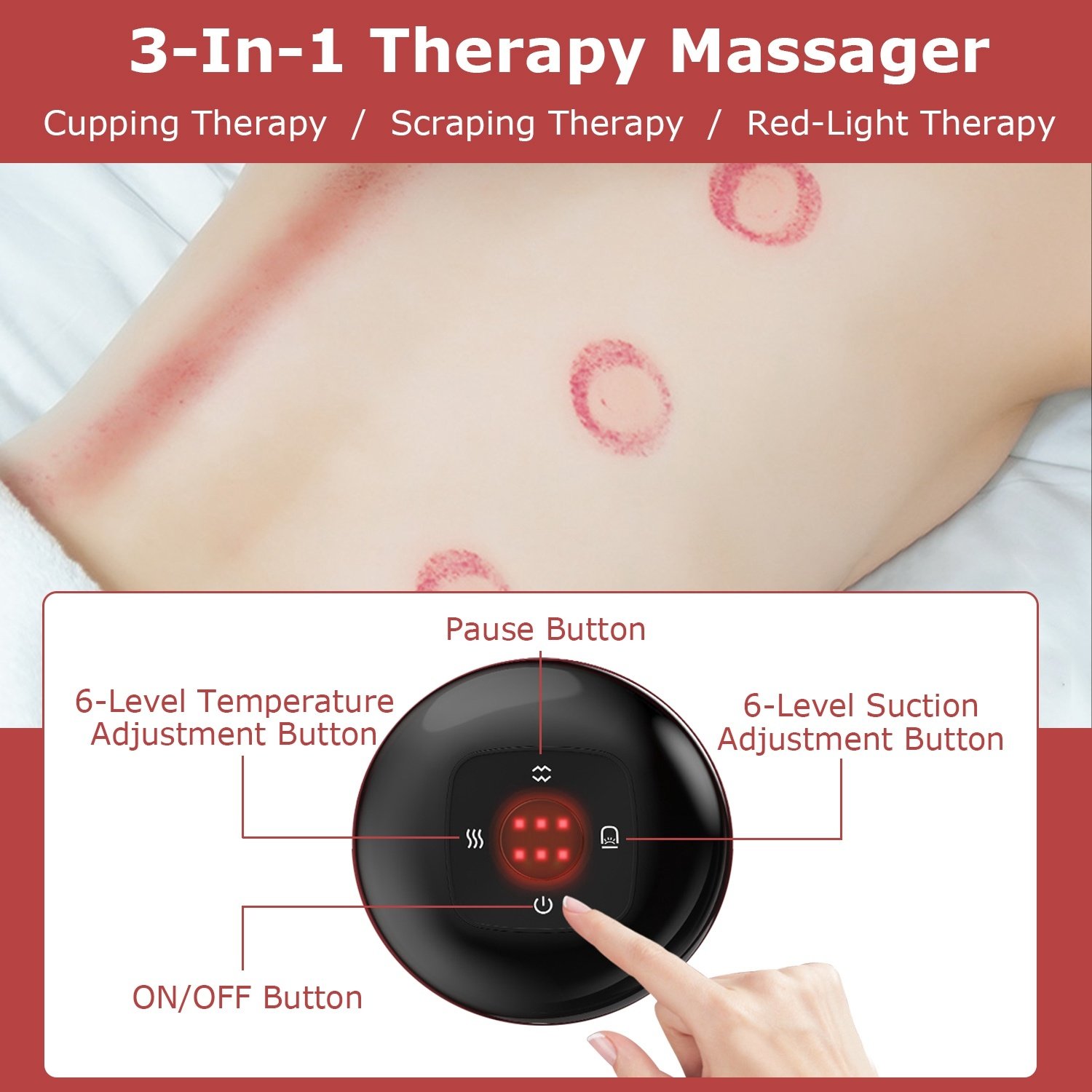 *3-In-1 Function*:Combined the cupping; scraping and red-light together; you can choose different gears according to your own need and do the massage by yourself without anyone's help. No other cups and tubes needed.